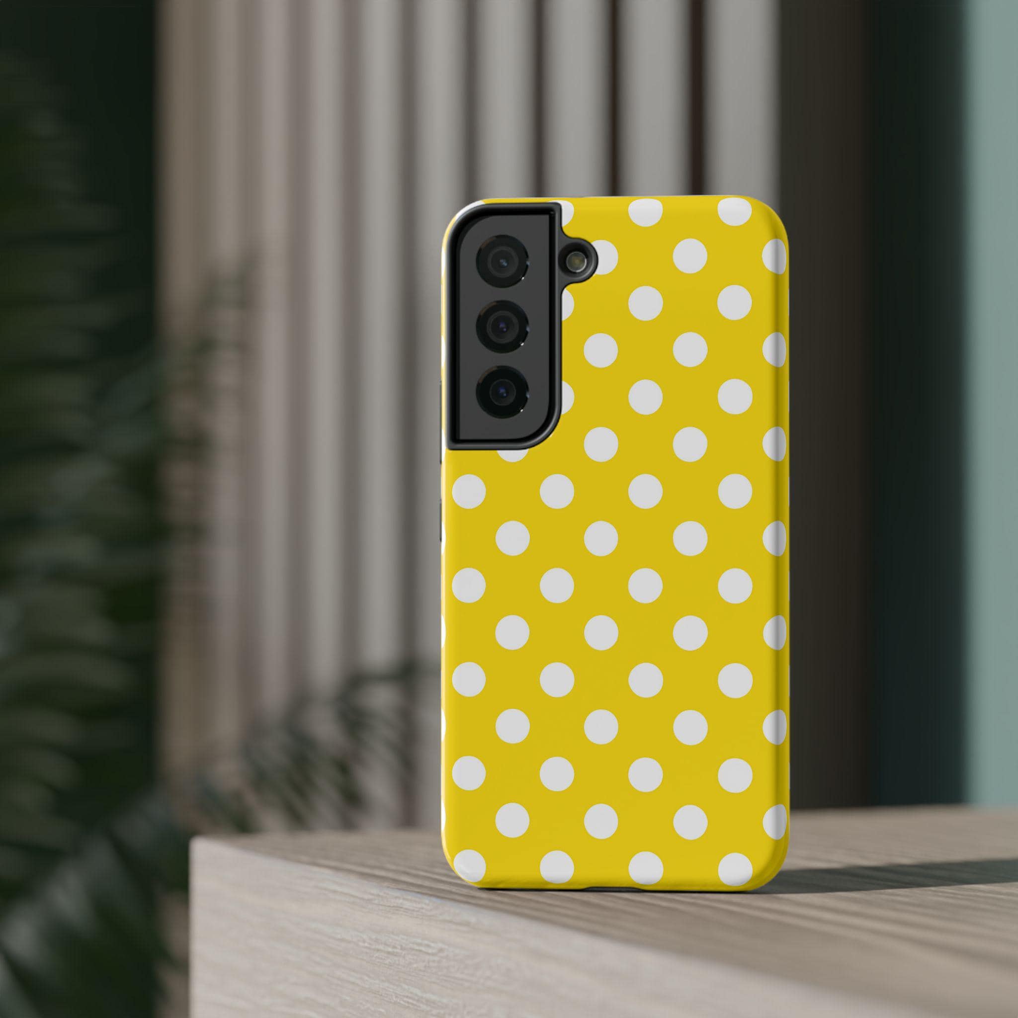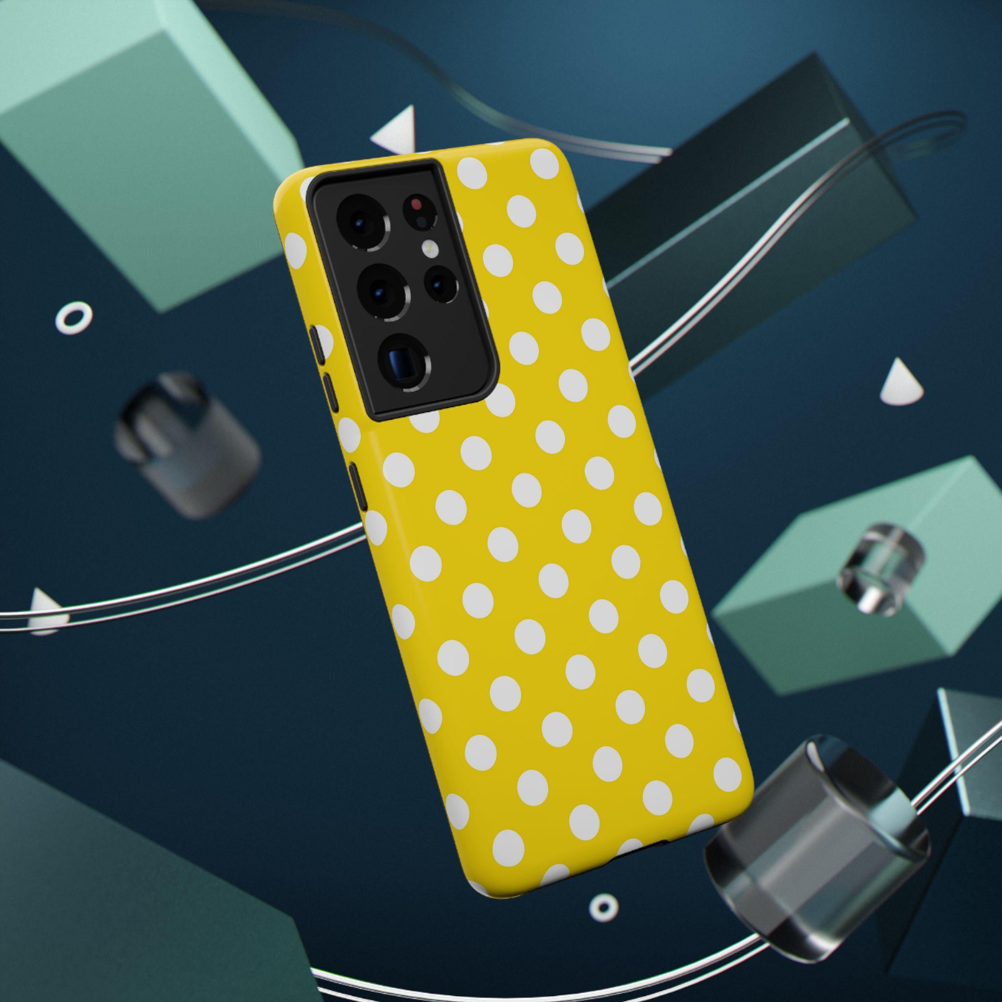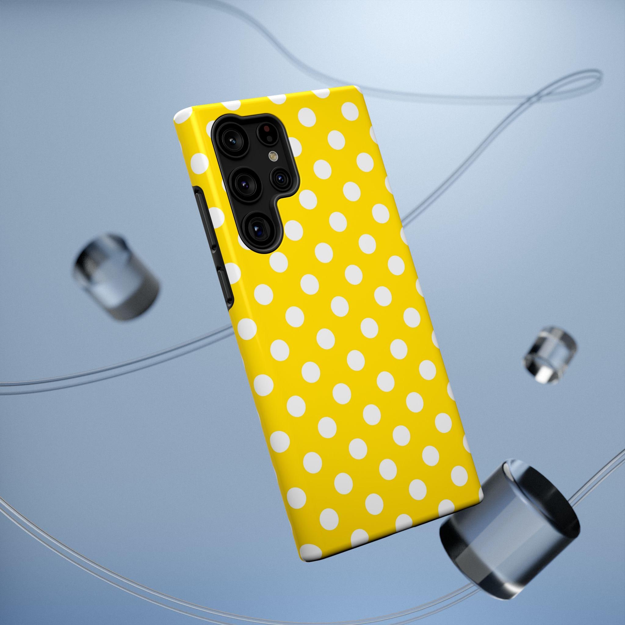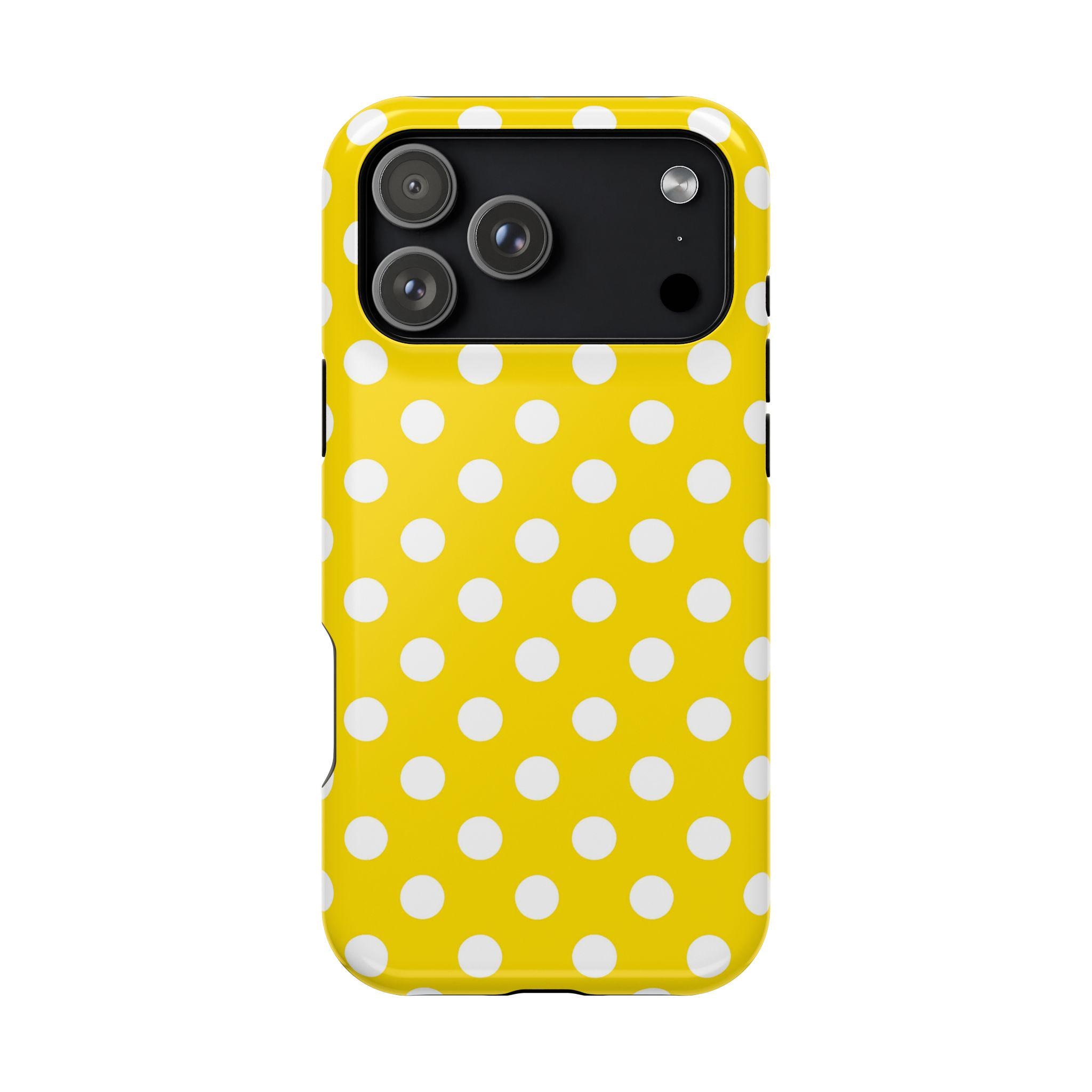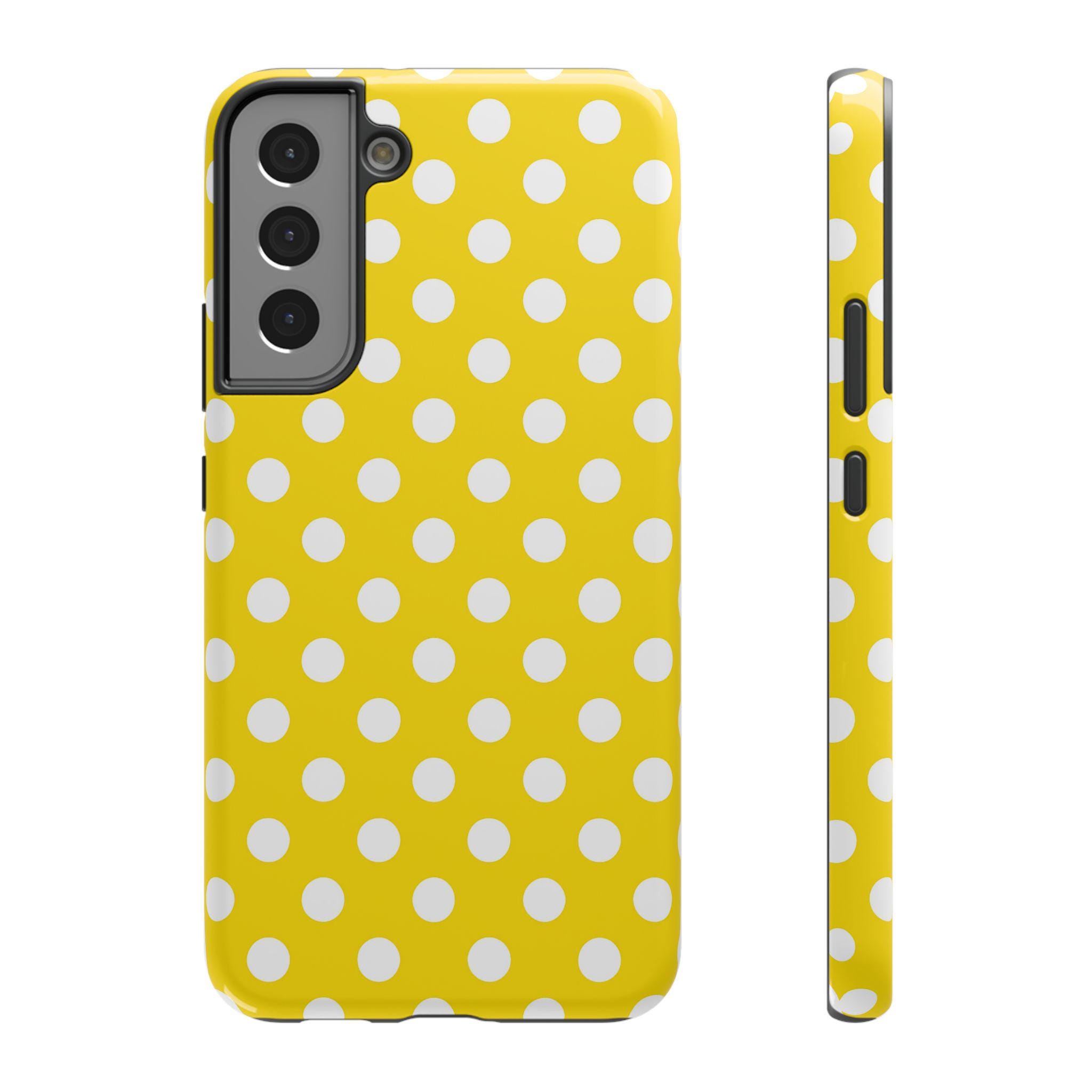 This yellow and white Polka Dot Phone Case offers personalized protection for your iPhone or Samsung models. With its durable, impact-resistant design, vibrant colors, and cute accessories, this phone case is a fun and stylish gift for adults. Perfect for adding a pop of color and personality to your phone while keeping it safe from scratches or bumps. Ideal for birthdays, holidays, or just treating yourself to a new case.